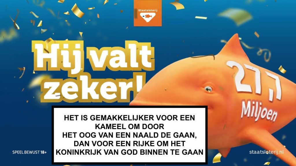 Die oneliner over de kameel en het oog van een naald zou – bedacht ik me – best geschikt zijn als waarschuwing bij reclames voor beleggingsproducten en loterijen. Net zoals het ‘Roken is dodelijk’ dat in zwarte rouwletters op een sigarettenpakje staat. ‘Geldzucht is de wortel van alle kwaad’ (niet van Jezus, maar van zijn volgeling Paulus) is ook geschikt. Enge plaatjes van de hel zijn misschien wat teveel voor onze seculiere tijden. Maar wat dacht je van een AI-gegenereerde afbeelding van een paar rijke patsers die bij een dichte deur staan te kniezen, omdat ze niet binnen mogen, terwijl ze zich normaal overal met een VIP-behandeling naar binnen weten te kopen? Dat moet toch kunnen. Het doel heiligt de middelen.